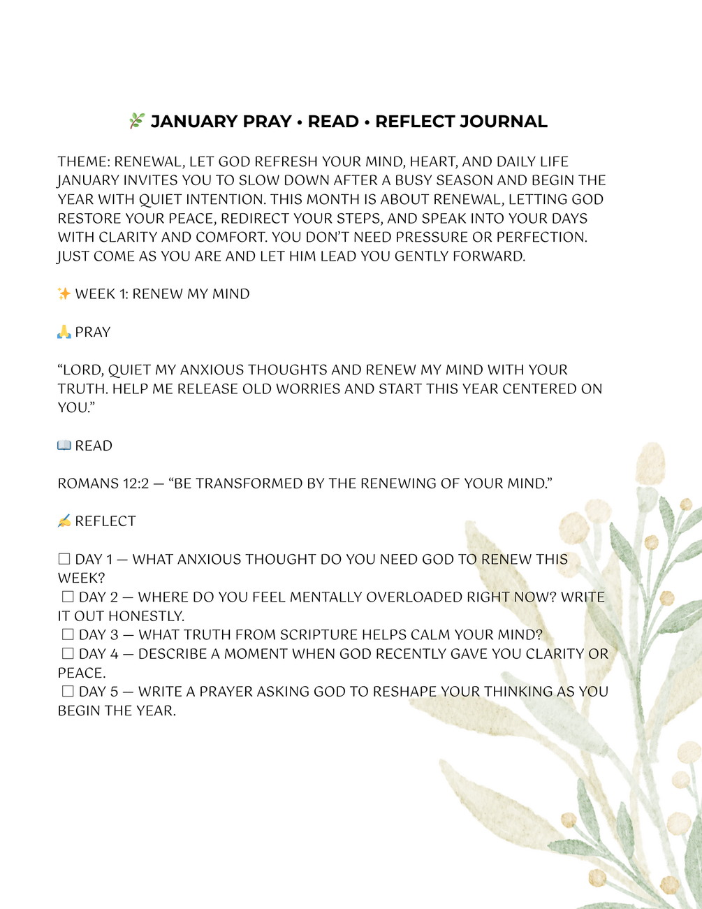 Begin the new year with clarity, peace, and a heart fully surrendered to God. The January Pray • Read • Reflect Journal Bundle was created to help Christian women start the year grounded in Scripture, centered in prayer, and open to God’s gentle renewal.